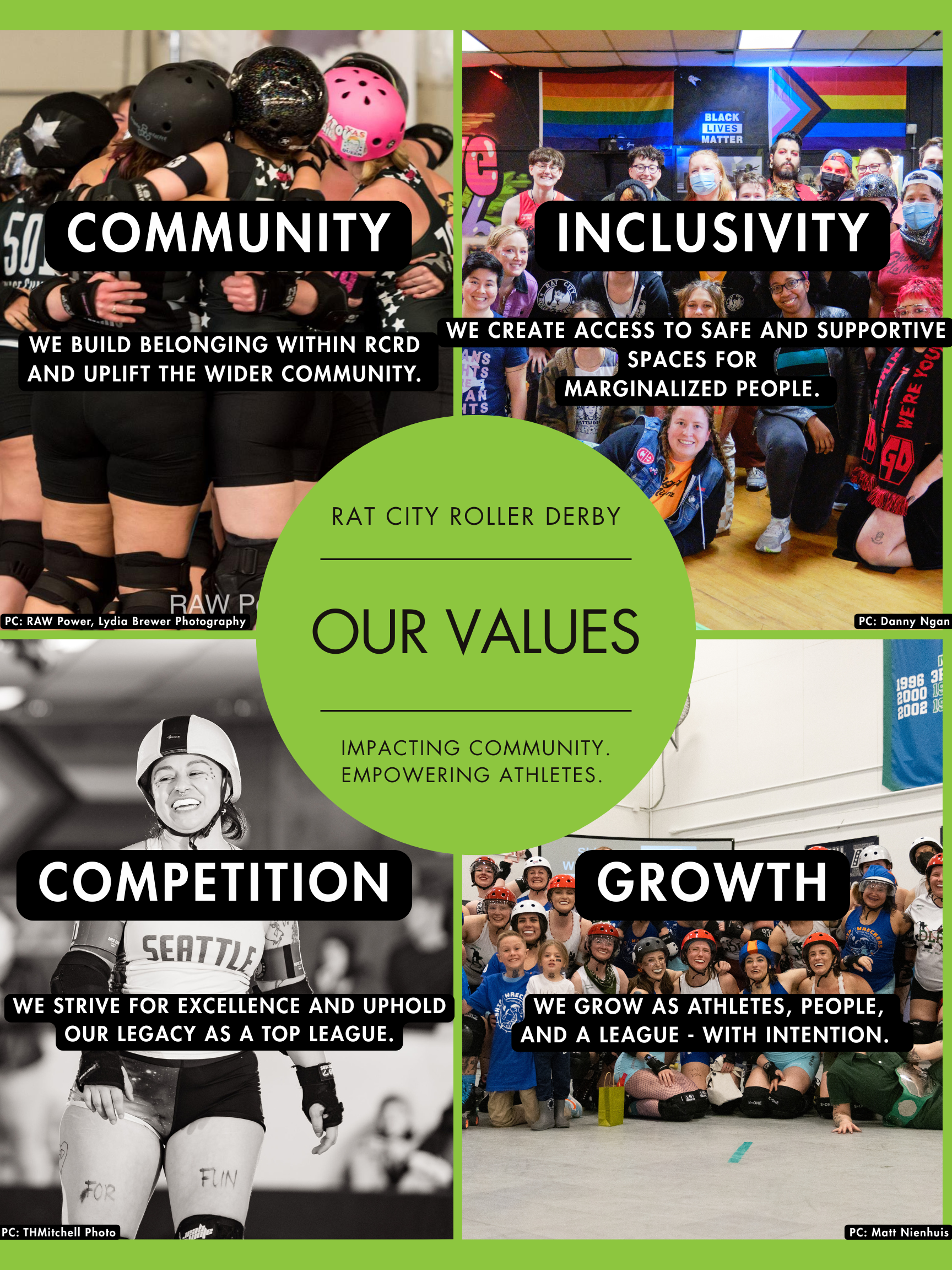 Rat City Roller Derby (RCRD) is Seattle’s premier flat-track roller derby league. RCRD was formed in 2004 and has grown into a league of ~120 active members, with hundreds more retired and alumni skaters. We provide skating opportunities and training for skaters 18+, from beginner level through our All-Star team which is currently in the top 20 teams in the WFTDA. We have three home teams – Derby Liberation Front, Grave Danger, and Throttle Rockets (Sockit Wenches was retired in 2022)– as well as a recreational team, Mischief. Those new to roller skating can join our Pinkies Program, and then graduate to our development programs Rat Lab and Maul Rats. Our skaters are active in the Seattle derby community, with many coaching juniors ages 8-18.